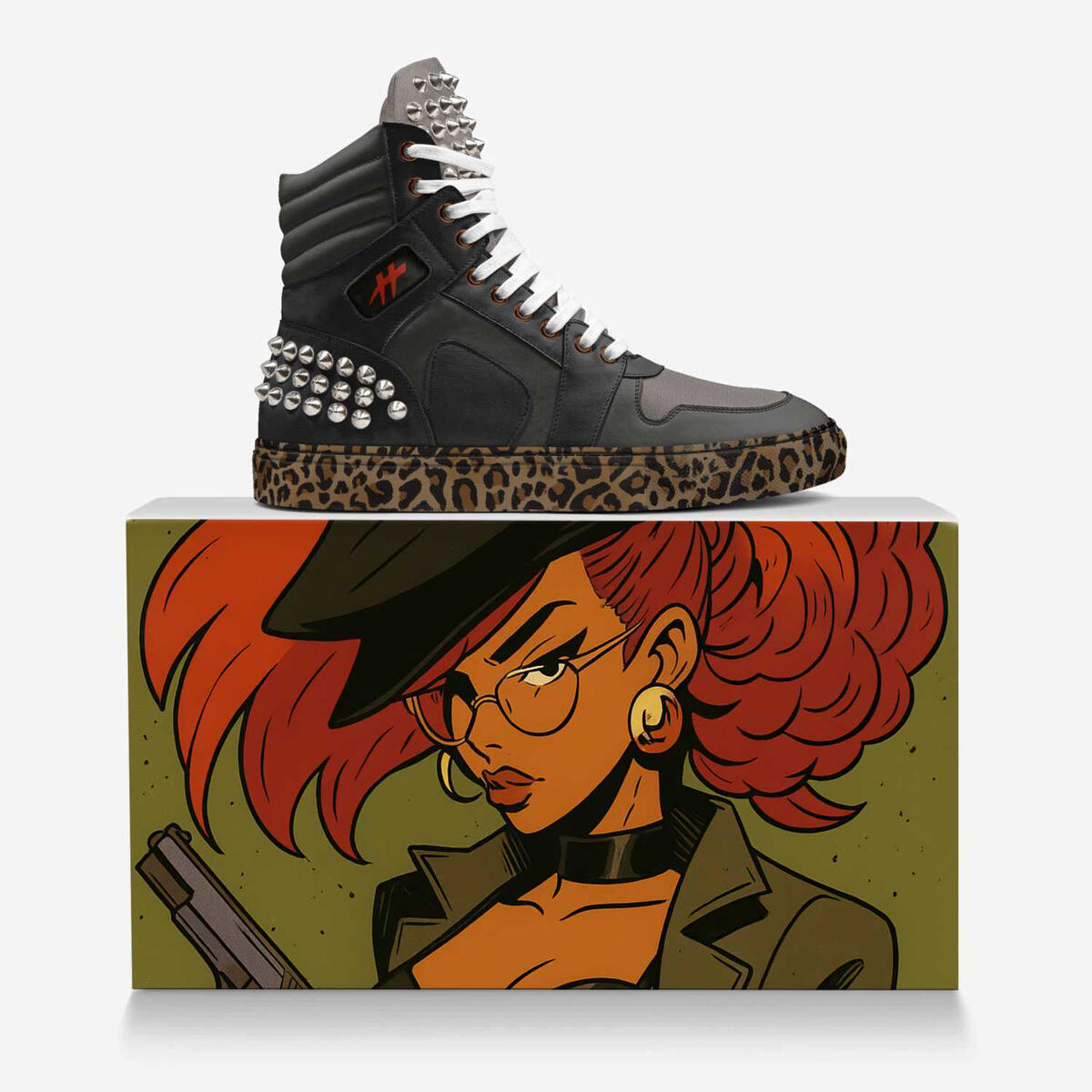 The Harley Drifts (OP-03) were designed for evasive movement through tight corridors, urban sprawl, and back-alley recon—when visibility must be low, but style stays high. Nicknamed “ghost laces” on the street due to their subtle profile and muted tones, these kicks make noise without needing volume.Box art features the Queen of No Nation, a rebel monarch without borders—she rules not by flag, but by fire. Her dripping crown, fractured glyphs, and piercing gaze mark her as a sovereign born from revolution, not heritage.These aren’t just shoes. They’re tactical camouflage for the cultural vanguard. Slip in. Vanish. Drift.