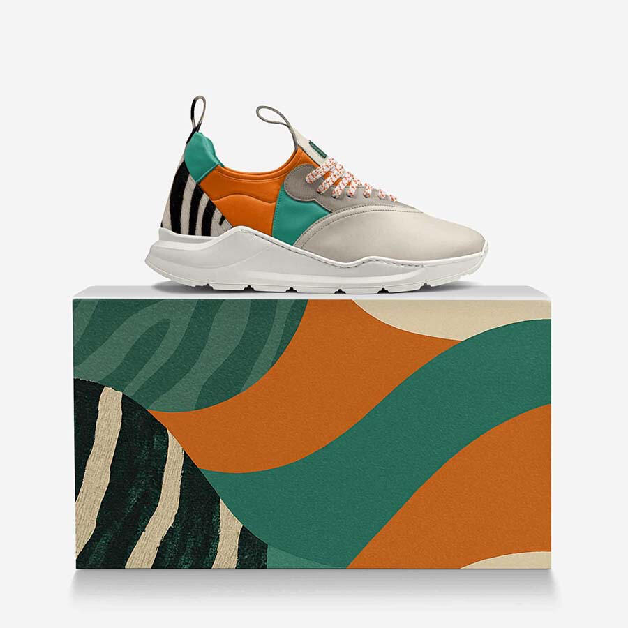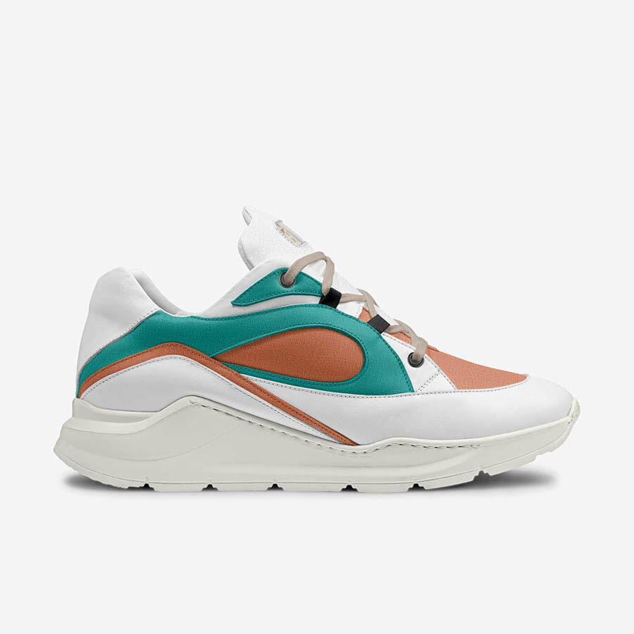 - Upper: Bone White Italian leather, Teal and Orange organic canvas, Soft grey suede eyestays