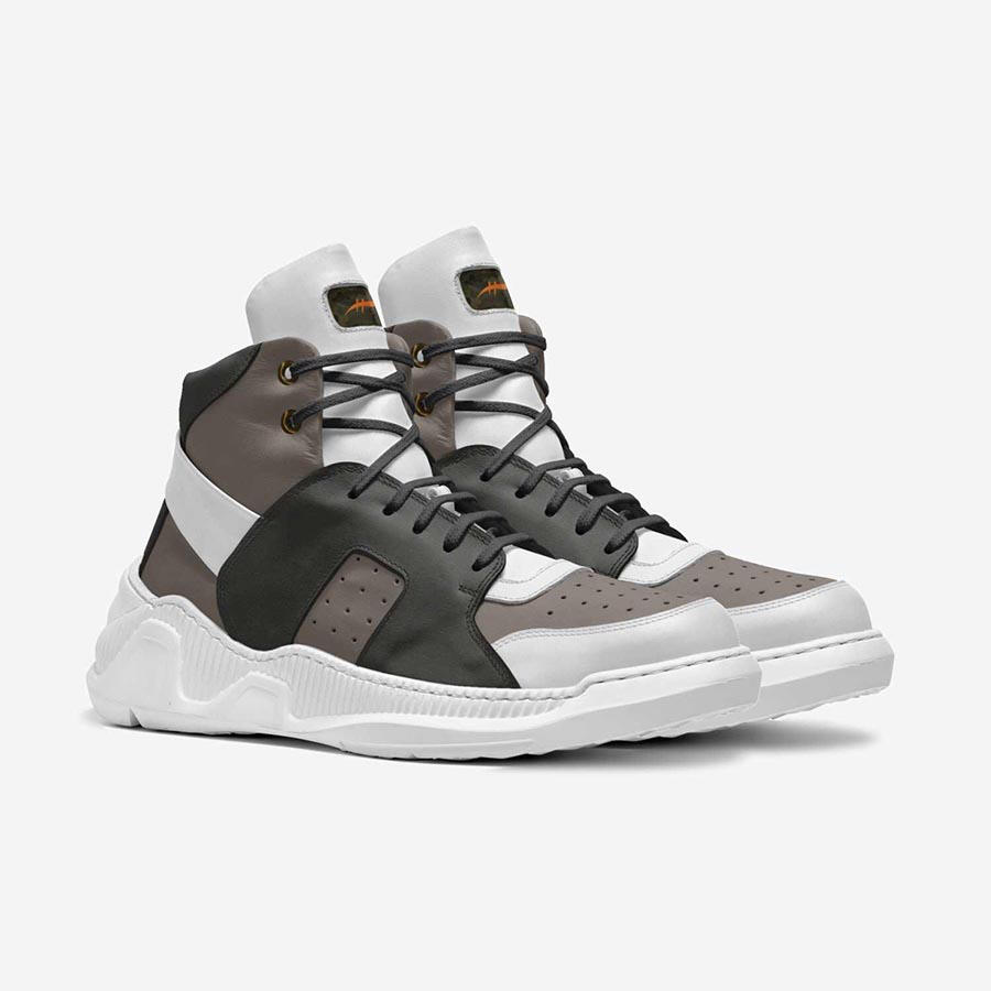 Built for signal blockers and street whisperers. OP-01 is a fortified high-top designed to deliver under pressure and disappear in plain sight. Inspired by cold war analog tech, bodega backdoors, and late-night pirate broadcasts.Plugs carry weight without saying a word.Muted greens and smoked greys wrap the core in heavy intention. White signal bands slash across the body—clean and untraceable. These aren’t just sneakers. They’re statements encoded in leather and muscle memory.